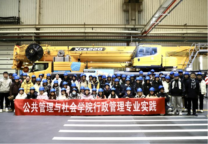 14时许,调研首站走进徐工集团。学子们在智能车间内,目睹了机械臂精准作业的智能制造场景,实时更新的生产数据直观呈现了“大国重器”的诞生过程。通过观摩全生产流程、聆听创新事迹,大家了解到徐工集团累计掌握100余项核心技术、6000项专利,破解行业超20%关键技术难题,研制出国内首台汽车起重机等标志性产品的硬核实力。带队老师现场感慨:“徐工不仅是制造业的领军企业,更是勇担使命的责任标杆。此次实地观摩,能让同学们跳出课本理论的框架,在工业制造实景中直观体悟行政管理在企业运营、技术创新中的实战价值。”同学们纷纷表示,钢铁厂房里的实干温度与自主创新的奋进故事,让“中国制造”不再是抽象概念,而是具象、厚重且充满力量的时代符号。
