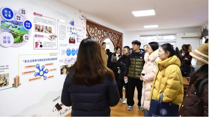 15时30分许,团队抵达昆仑社区。在智慧治理指挥中心,同学们通过平台演示,直观感受大数据赋能基层治理的数字化、精细化成效;便民服务大厅“一窗受理、集成服务”的高效模式,居民议事厅“共建共治共享”的实践场景,让大家对基层治理有了立体认知。社区负责人“用脚步丈量社区,用真心服务群众”的事迹分享,深化了学子们对基层行政管理者责任担当的理解。一名新生感慨:“专业知识原来能如此直接地转化为服务群众的实际行动。”
